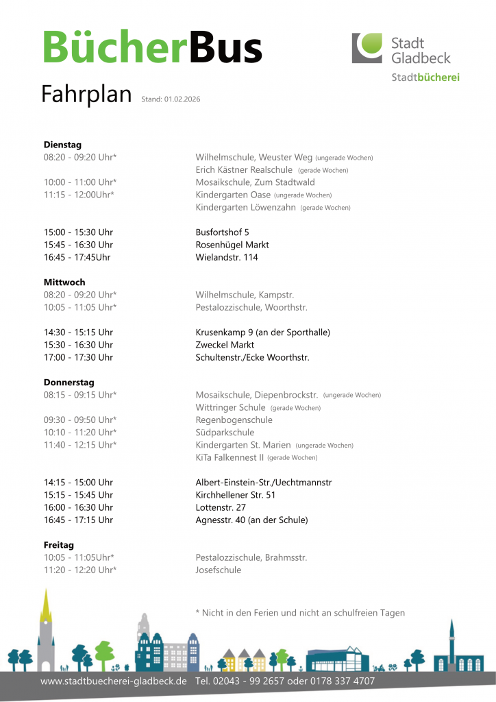 Sie erreichen den Bücherbus während der Fahrzeiten unter Tel. 02043 99 2661.